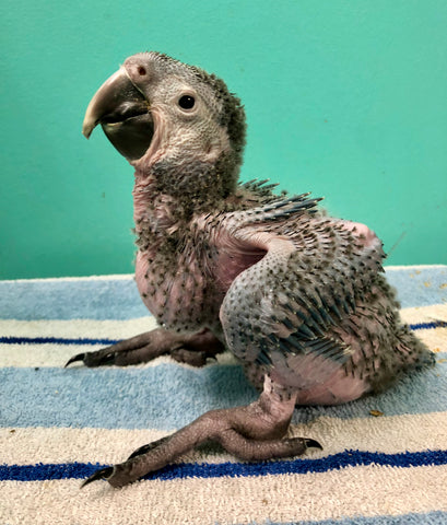 As of the writing of this blog, Kuzie is just shy of four weeks old and already weighs over 600 grams. He is definitely on track to outweigh his mother and possible his father (Kirby is a big boy though, so we’ll see). Feathers on Kuzie’s tail and wings are just starting to poke through and show us hints of blues and greens.
